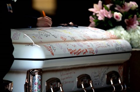 | Le cercueil de Keyla Salazar, 13 ans, une des victimes de la fusillade au Festival de l'ail, lors de ses funérailles le 6 août à San José aux États-Unis. |