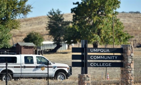 | L'entrée du campus à Roseburg, dans l'Oregon, le 2 octobre au lendemain d'une fusillade qui a fait dix morts dont le tueur. |