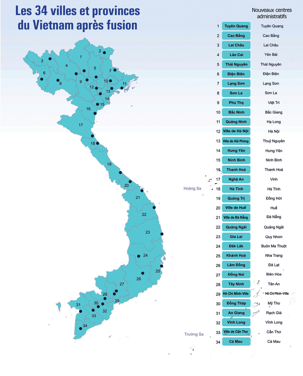 Désormais, le Vietnam compte 34 unités administratives provinciales, dont 28 provinces et six villes. Parmi elles, 19 ont été recomposées à la suite de cette fusion. Onze, comprenant Cao Bang, Diên Biên, Lai Châu, Lang Son, Son La, Quang Ninh, Hanoï, Thanh Hoa, Nghê An, Hà Tinh et Huê, restent inchangées et ne sont pas concernées par cette réorganisation.