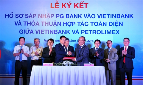 | Signature du traité de fusion entre la PG Bank et la VietinBank, en mai à Hanoi. |