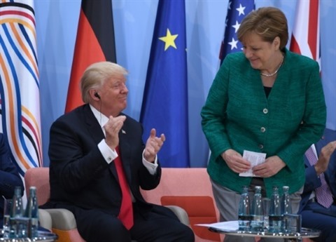 | Le président américain Donald Trump et la chancelière allemande Angela Merkel à Hambourg, en Allemagne, le 8 juillet 2017. |