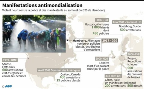 | Carte mondiale des manifestations antimondialisation lors de sommets internationaux depuis 1999 avec bilans des heurts avec la police, jusqu'au Sommet du G20 à Hambourg des 7 et 8 juillet 2017. |