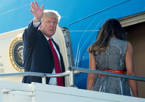 | Donald Trump et son épouse Melania montent à bord d'Air force one pour quitter Hambourg, le 8 juillet 2017. |