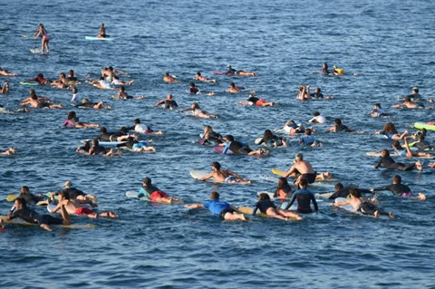 Dans ce village, les surfeurs réunis se sont mis à l'eau dans la soirée et ont formé une chaîne symbolique au large. Sur la petite plage se trouvaient des pancartes plantées dans le sable avec des slogans tels que "La planète se réveille, on s'éveille avec elle", et même des messages écrits sur des planches de surf, à l'instar de "océan l'esprit, société au défi".