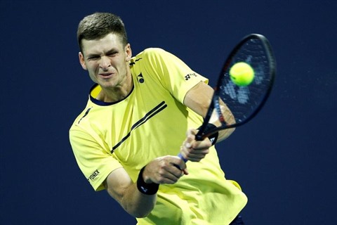 | Le Polonais Hubert Hurkacz face à l'Autrichien Dominic Thiem au tournoi de Miami, le 22 mars 2019. |