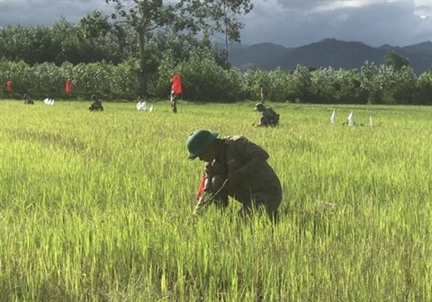 | Des soldats vietnamiens témoignent de détection et de déminage des UXO (munitions non explosées) dans le Centre. |