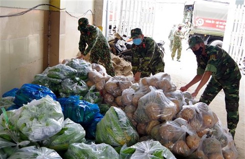 | Les soldats de la division 9 de la 4e zone militaire distribuent de la nourriture aux habitants en difficulté de Hô Chi Minh-Ville. |