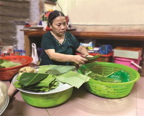 | Mme Xuân, propriétaire de l’atelier Lua Xuân, prépare les feuilles de bananier pour emballer ses gâteaux "phu thê". |