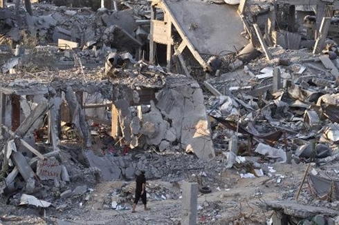 | Un Palestinien traverse le quartier dévasté de Ac-Chaas dans le Nord de la bande de Gaza le 16 août. Photo : AFP/VNA/CVN |