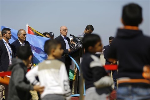 | Le coordonnateur humanitaire des Nations unies pour le territoire palestinien occupé, Jamie McGoldrick (centre) à Beit Lahia dans le Nord de Gaza. |