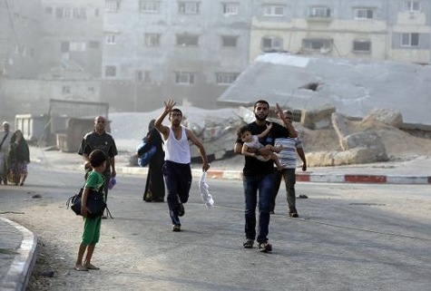 | Des Palestiniens fuient leur maison dans le quartier de Chajaya, à l'est de Gaza, le 20 juillet 2014. |