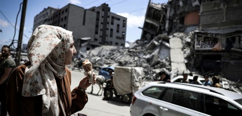 | Une Palestinienne mange une glace devant un bâtiment dévasté par une frappe israélienne à Gaza, le 22 mai. |