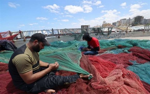 | Des pêcheurs palestiniens préparent des filets avant de partir en mer, à Gaza, le 22 mai. |