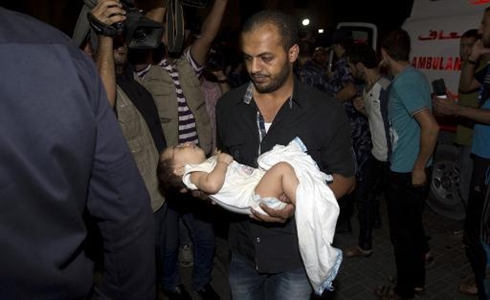 | Un homme transporte un bébé blessé après un raid israélien sur Gaza, le 15 juillet dans l'enclave palestinienne. Photo : AFP/VNA/CVN |