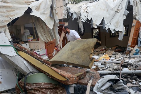 | Un Palestinien récupère des affaires dans les décombres de sa maison, le 8 août à Rafah, dans le Sud de la bande de Gaza. |