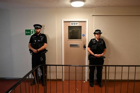 | Des policiers montent la garde le 21 juin dans un immeuble où aurait vécu un suspect d'une attaque meurtrière au couteau commise la veille dans un parc de Reading, à l'ouest de Londres. |