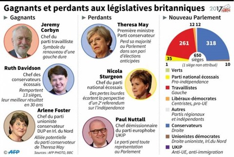 Le Parti conservateur de Mme May a perdu sa majorité absolue jeudi 8 juin et dépend désormais du DUP, dont les dix élus permettraient aux Tories (318 députés) d'atteindre les 326 sièges requis pour gouverner tant bien que mal.