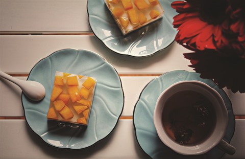 - Verser la gelée de coco chaude sur la gelée à la mangue. Conserver dans le frigo durant environ 4 heures.