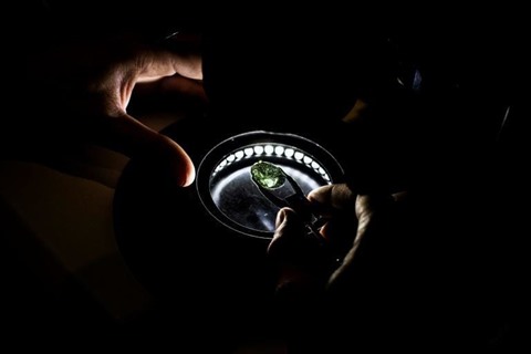 | Un homme inspecte une pierre précieuse au salon GemGeneve, le 11 mai à Genève (Suisse). |
