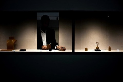 | Un homme dispose des bijoux dans une vitrine au salon GemGeneve, le 11 mai à Genève. |