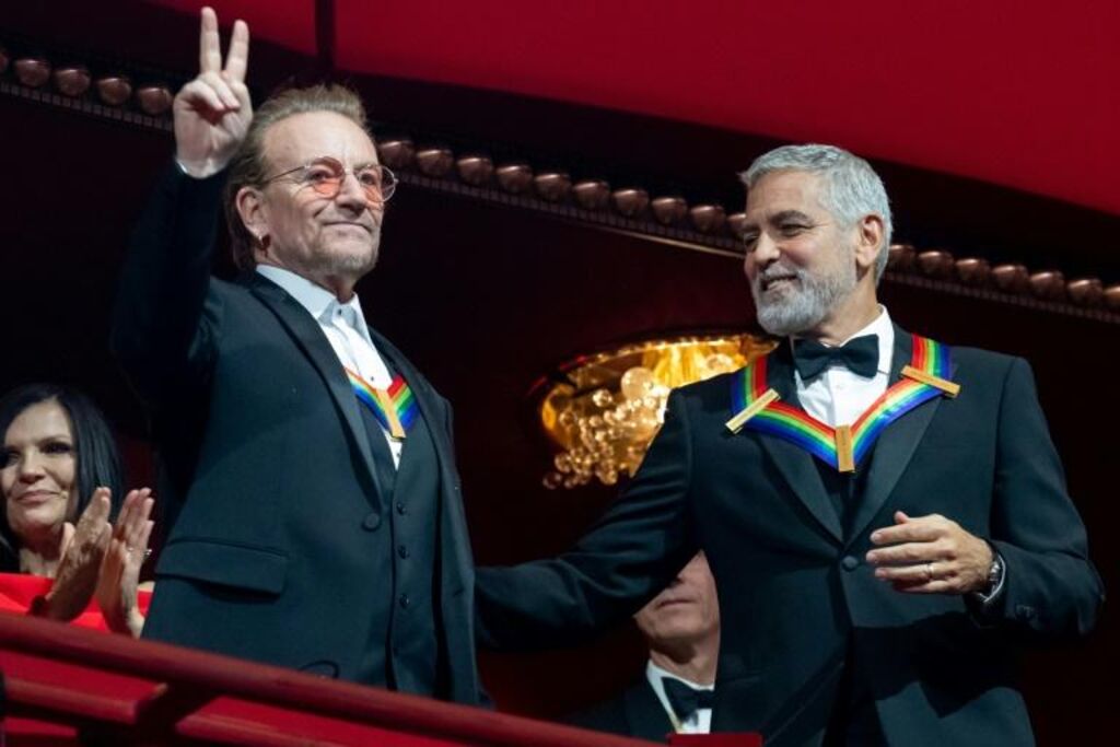 | L'acteur américain George Clooney (droite) et le chanteur Bono du groupe U2 honorés par le Kennedy Center, le 4 décembre à Washington. |