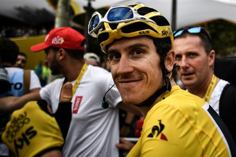 | Le Britannique Geraint Thomas après la 21e étape du Tour de France 2018, le 29 juillet sur les Champs-Élysées à Paris. |