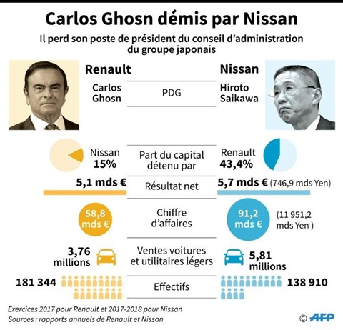 Le conseil d'administration de Nissan, dans lequel siègent deux représentants de Renault, a jugé à l'unanimité que les soupçons pesant sur Carlos Ghosn, maître d'œuvre du mariage franco-japonais, suffisaient pour le chasser de son poste de président. Nissan a justifié son éviction par "des actes graves confirmés", mentionnant "une minimisation de ses revenus durant une longue période dans les rapports financiers, une utilisation frauduleuse à des fins personnelles de fonds d'investissements et de notes de frais", selon un communiqué. Hiroto Saikawa, patron exécutif du constructeur japonais, avait demandé publiquement cette révocation dès lundi 19 novembre, lors d'une conférence de presse entièrement à charge contre Carlos Ghosn, son ancien mentor.