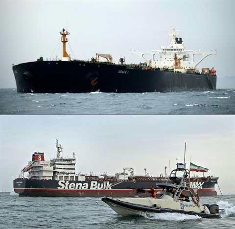 | Le pétrolier iranien "Grace 1" (haut), et une patrouille des Gardiens iraniens de la Révolution près du pétrolier britannique "Stena Impero". |