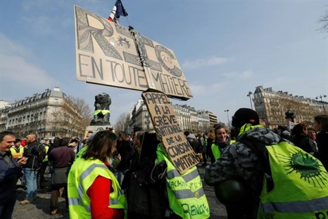 | Des "gilets jaunes" à la place Denfert Rochereau à Paris le 23 mars. |