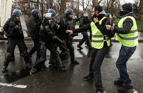 | Des manifestants du mouvement des "gilets jaunes" face à des gendarmes mobiles, le 22 décembre à Paris. |