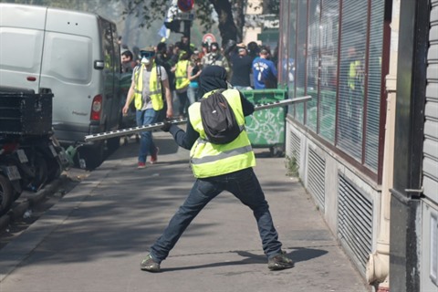 | Un manifestant essaye de casser une vitrine durant la manifestation des "gilets jaunes", le 20 avril à Paris. |