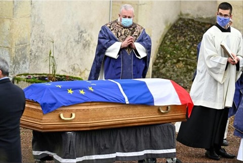 | Le prêtre Don Stephane (g) devant le cercueil de l'ancien président Valéry Giscard d'Estaing, lors des obsèques en l'église d'Authon, le 5 décembre 2020. |