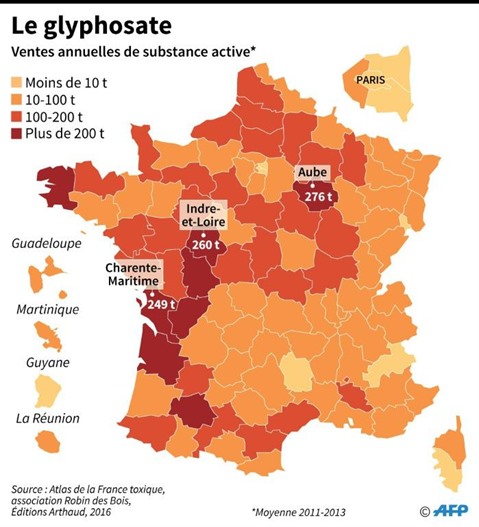 | Glyphosate : ventes annuelles de substance active par département en France selon une étude de l'Association écologiste Robin des Bois. |