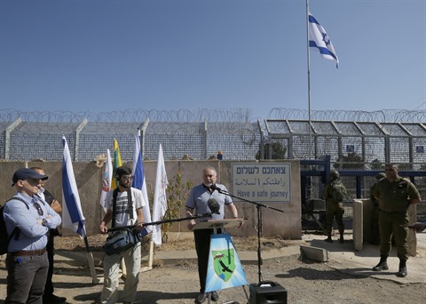 | Le ministre israélien de la Défense, Avigdor Lieberman (centre), lors d'une visite à la frontière de Quneitra le 27 septembre. |