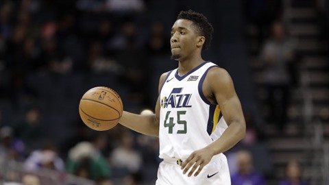 | Donovan Mitchell du Utah Jazz lors du match de NBA face aux Sacramento Kings, à Denver, le 18 février 2019. |