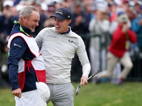 | L'Anglais Matt Fitzpatrick (droite) et son caddy Billy Foster sur le green du 18e trou, au dernier tour du 122e US Open à Massachusetts, le 19 juin. |