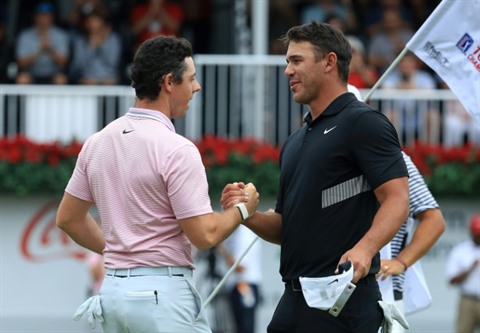 | L'Américain Brooks Koepka (droite) avec le Nord-Irlandais Rory McIlroy au Tour Championship, le 25 août, à Atlanta. |