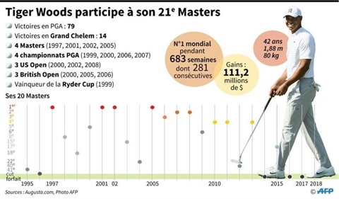 | Biographie et palmarès de Tiger Woods présent au Masters 2018 de golf à Augusta. |