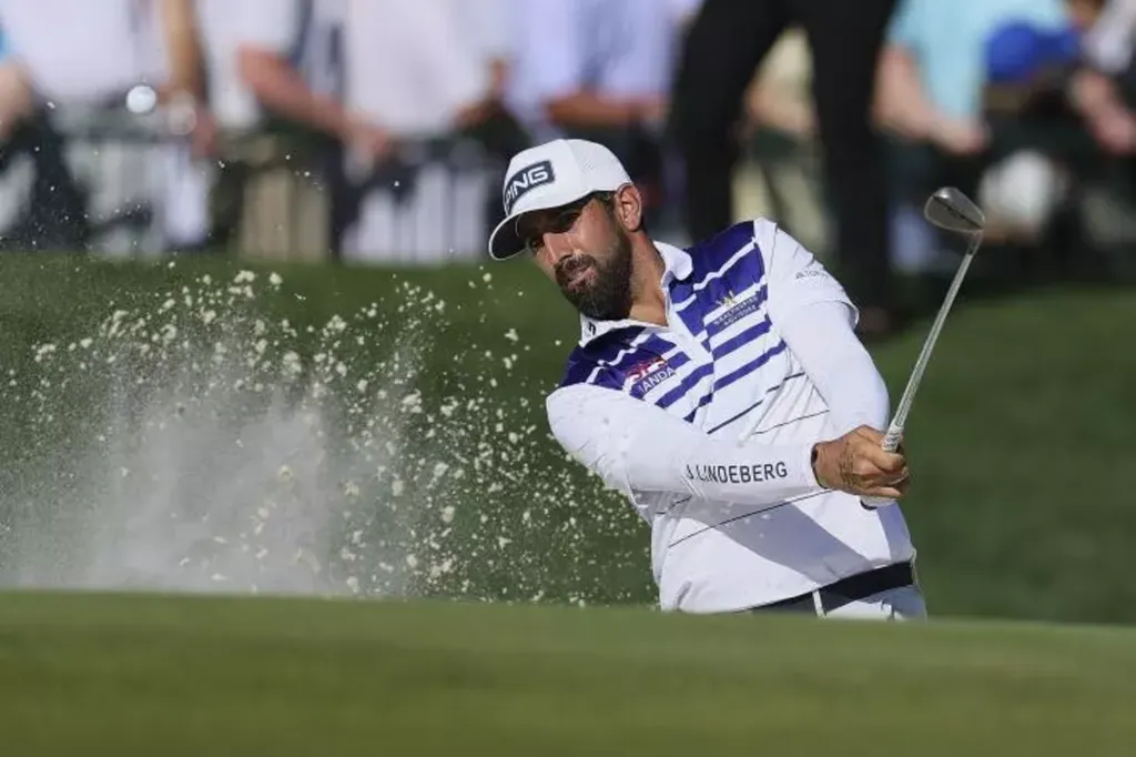 | Le Français Matthieu Pavon se sort d'un bunker pendant le dernier tour du championnat PGA à Charlotte, en Caroline du Nord. |