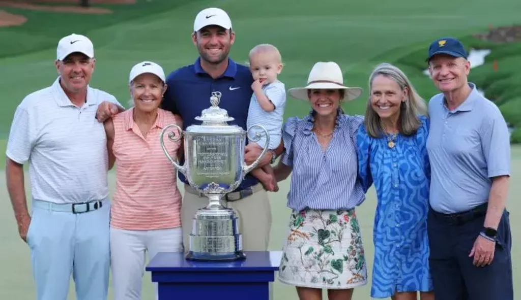 | L'Américain Scottie Scheffler pose avec sa famille après sa victoire dans le championnat PGA à Charlotte. |