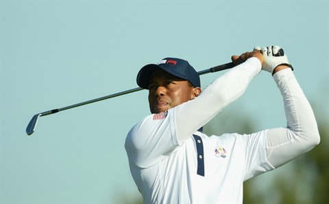 | L'Américain Tiger Woods lors de la 2e journée de la Ryder Cup, le 29 septembre 2018 à Saint-Quentin-en-Yvelines. |