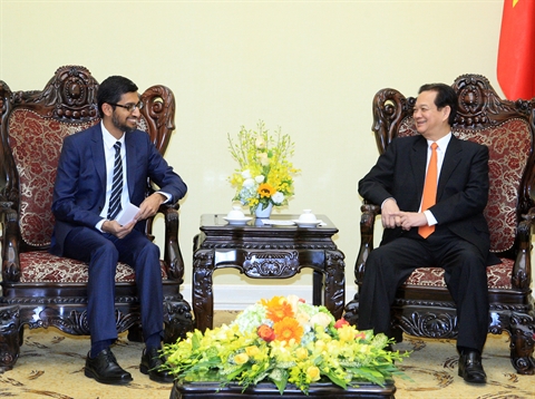 | Le Premier ministre Nguyên Tân Dung (droite) et le directeur général exécutif du groupe américain Google, Sundar Pichai, le 22 décembre à Hanoi. |