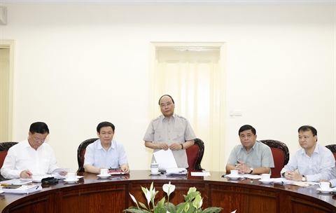 | Le Premier ministre Nguyên Xuân Phuc (centre) lors de la séance de travail avec des ministres, le 30 mai à Hanoi. |