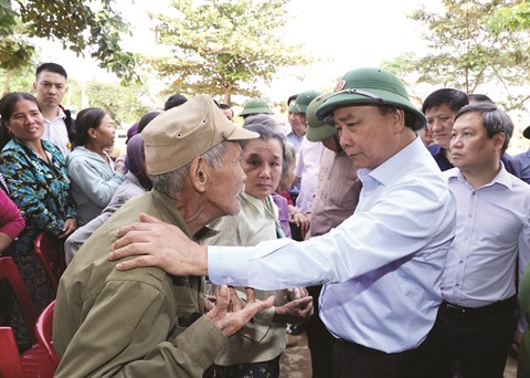 | Le Premier ministre Nguyên Xuân Phuc (droite) soulage les sinistrés du village de Dông Tu, dans la province de Quang Binh, le 24 octobre. |