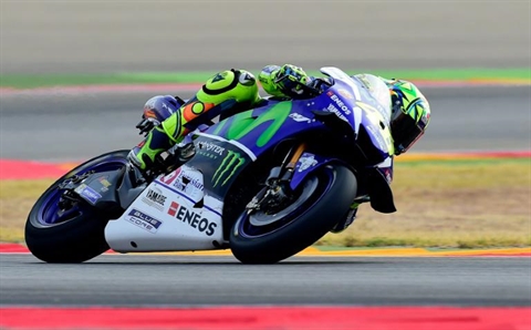 | L'Italien Valentino Rossi sur Yamaha, troisième du GP d'Aragon à Alcaniz, le 25 septembre. |