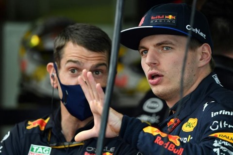 | Le pilote Red Bull néerlandais Max Verstappen (droite) avec un membre de son écurie, le 8 avril, sur le circuit de Melbourne, en Australie. |