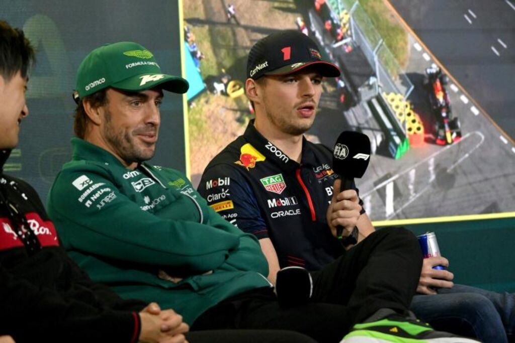 | Le pilote Red Bull, Max Verstappen (droite), avec son rival d'Aston Martin Fernando Alonso lors d'un point presse avant le GP d'Australie à Melbourne, le 30 mars. |