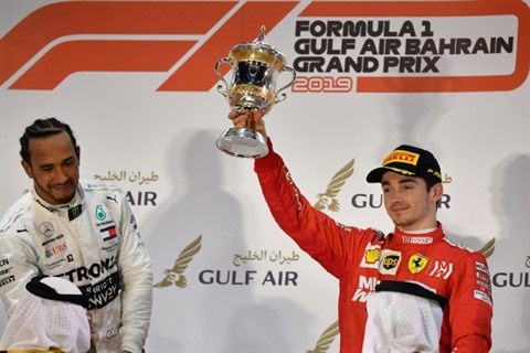 | Lewis Hamilton (gauche) vainqueur du GP de Bahreïn et Charles Leclerc (3e ) sur le podium le 31 mars. |