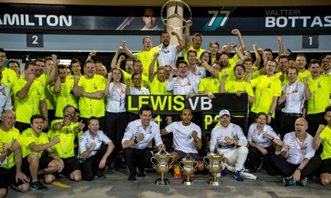 | Lewis Hamilton (centre) remporte le GP de Bahrein devant Valtteri Bottas et Charles Leclerc le 31 mars. |