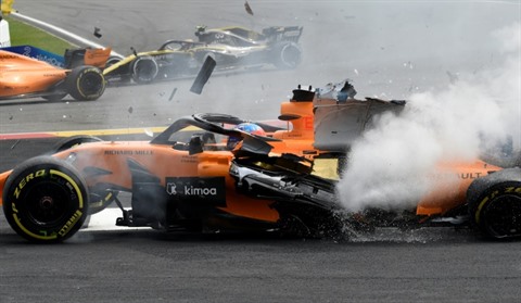 | L'Espagnol Fernando Alonso abandonne suite à une collision au premier tour du GP de Belgique le 26 août. |